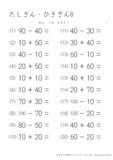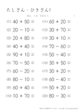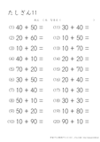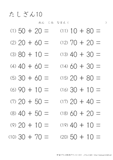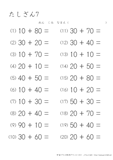 20より大きい数のたし算のプリントです。10のまとまりがいくつあるのかを考えて計算をするようにしましょう。この学習は子どもにとって身近なものである10円玉の計算なので、思ったよりも得意な子が多いようです。苦手にする子は10円玉を10枚用意して少しずつ慣れていってほしいと思います。