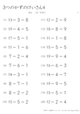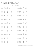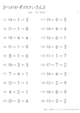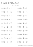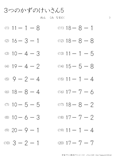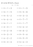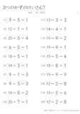 3つの数のひき算です。たし算と同様に順番に計算をしていきましょう。くり下がりがなく最後まで引ききれる問題と一回目の計算で10となり、10からひき算をする問題の2種類が混ざっています。