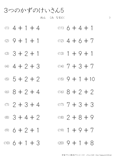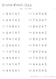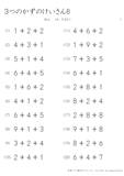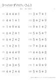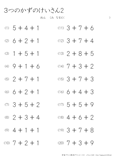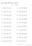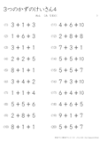 3つの数の計算問題です。たし算だけを使って解いていく問題とひき算だけをつかって解いていく問題です。前から順番に計算することのできる問題です。くり上がりやくり下がりはありません。