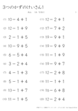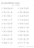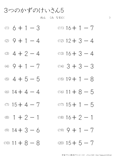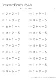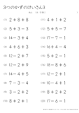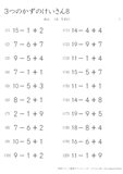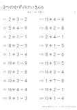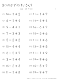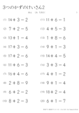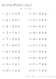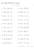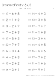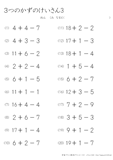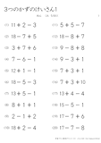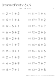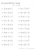 たし算だけ、ひき算だけの3つの数の計算を練習したい場合は「3つのかずのけいさん①」をどうぞ。