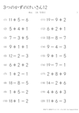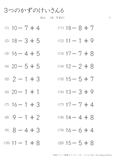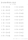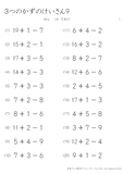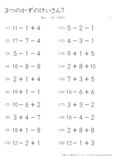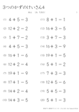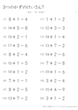 3つの数の計算のまとめです。たし算たし算・ひき算ひき算・たし算ひき算・ひき算たし算の問題がランダムに出されています。たし算なのにひき算をしてしまったり、ひき算なのにたし算をしてしまったりすることのないように、落ち着いて問題に臨み、習熟してほしいです。