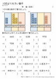 「3けたの数(読み方・表し方)①」と同じように100・10・1のまとまりの数から数字に表したり「123→百二十三」「四百五十六→456」というように漢字は数字に数字は漢字に直して書いたりする問題があります。