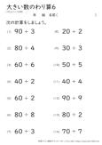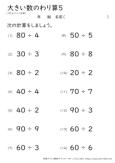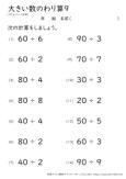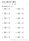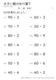 3年生で学習する大きい数のわり算のプリントです。90÷3の計算や96÷3の計算など、それぞれの位で割り切れるわり算ができるものです。
