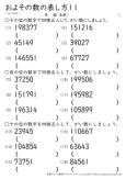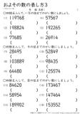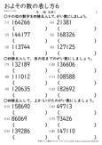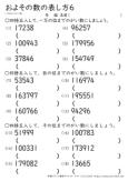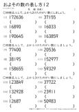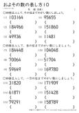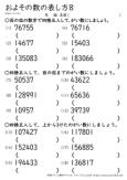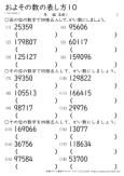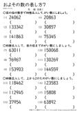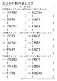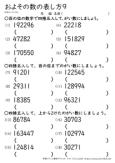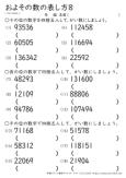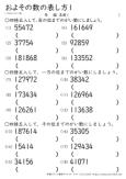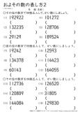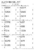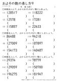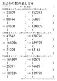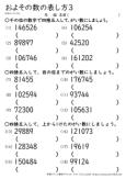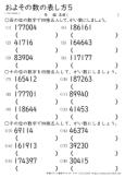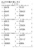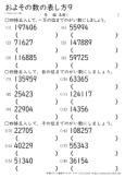 およその数の表し方についてのプリントです。ここでは問題の数を四捨五入をしておよその数を書いていきます。