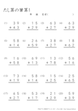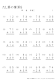 繰り上がりが1回ある筆算のプリントです。はじめのうちは、繰り上がった数を計算し忘れてしまう子も多いと思います。何度も解いて、繰り上がった数も計算する注意力も身に付けてほしいです。
