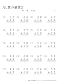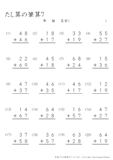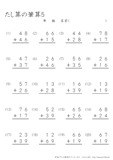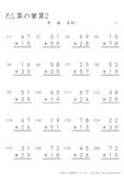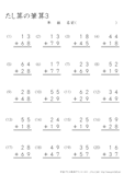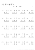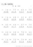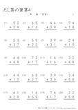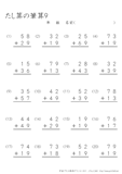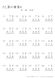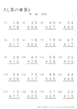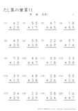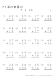 答えに空位(0)のある数を含むたし算の筆算のプリントです。繰り上がりが1回あります。つまり、1の位を計算する10になるような問題です。すべての問題に空位がある訳ではなく、20問の筆算問題のうち、数問にだけ答えに空位が含まれています。